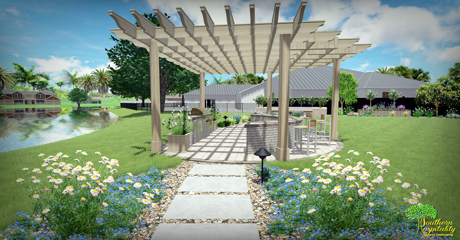 A virtual design of flowers and pergula with outdoor kitchen and stepping stones set in river rock.