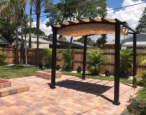 Beautiful paver patio with a pergola, planter and fire pit to match the nice backyard setting